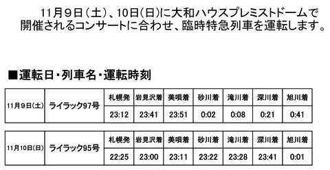 旭川駅からは11月9,10日のSnow Manコンサートなど大型ライブの際にはJR北海道にて臨時列車を出すこともあります。札幌駅まで1本で行けるため、ドームまで2時間程度かかるものの、遅い時間まで電車が走ってる好アクセスの穴場エリアです。